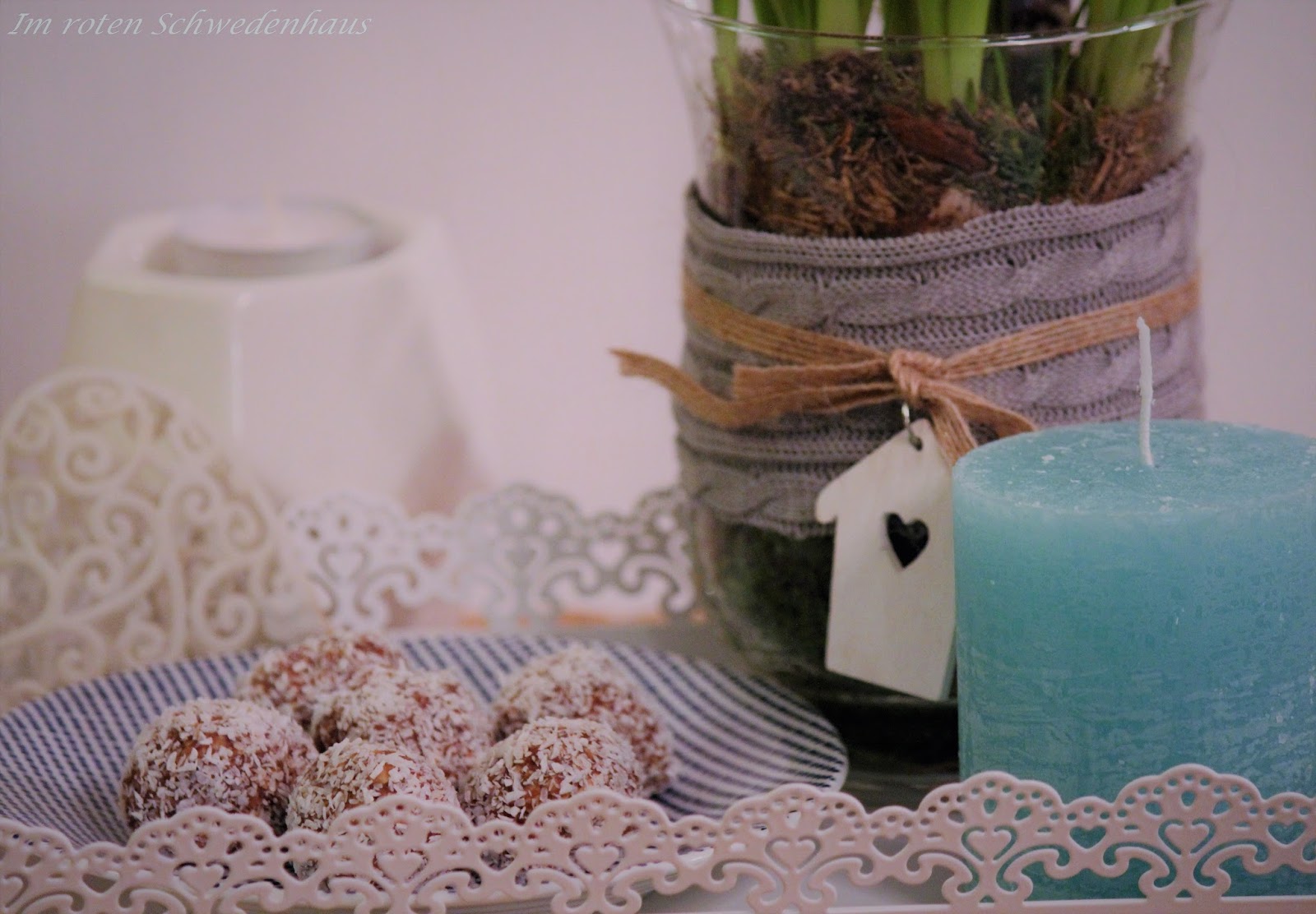 Weil aber noch von Weihnachten eine Packung Kokosraspeln im Haus war, gab es zumindest eine süße schwedische Nachspeise – „Chocladbollar“, kleine leckere Schokoladenkugeln mit Kokosraspeln. Ganz ohne zu backen sind sie superleicht und schnell zubereitet.