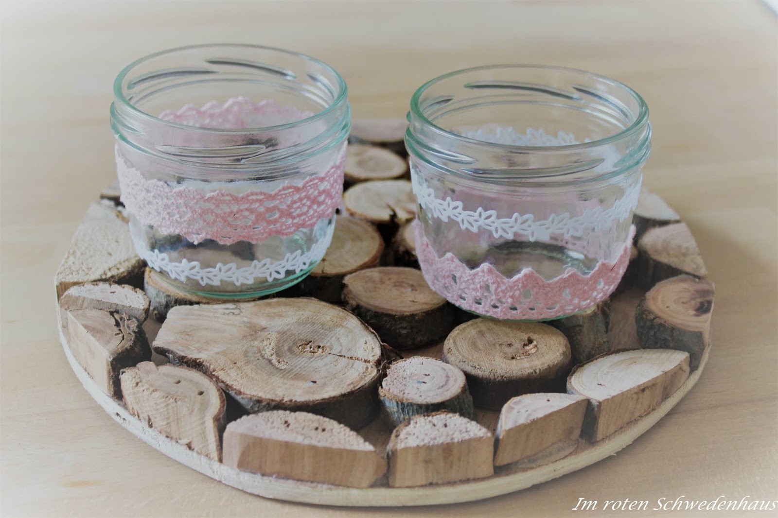 Der perfekte Style einer romantischen, sommerlichen und lässigen Gartenhochzeit war für mich eine Vintage- inspirierte Tisch- und Zeltdekoration mit viel Spitze in Kombination mit Sackleinen. Zusammen mit meiner Trauzeugin hübschte ich Marmeladengläser mit selbstklebender Dekospitze in weiß und rosa zu romantischen Teelichtern auf.