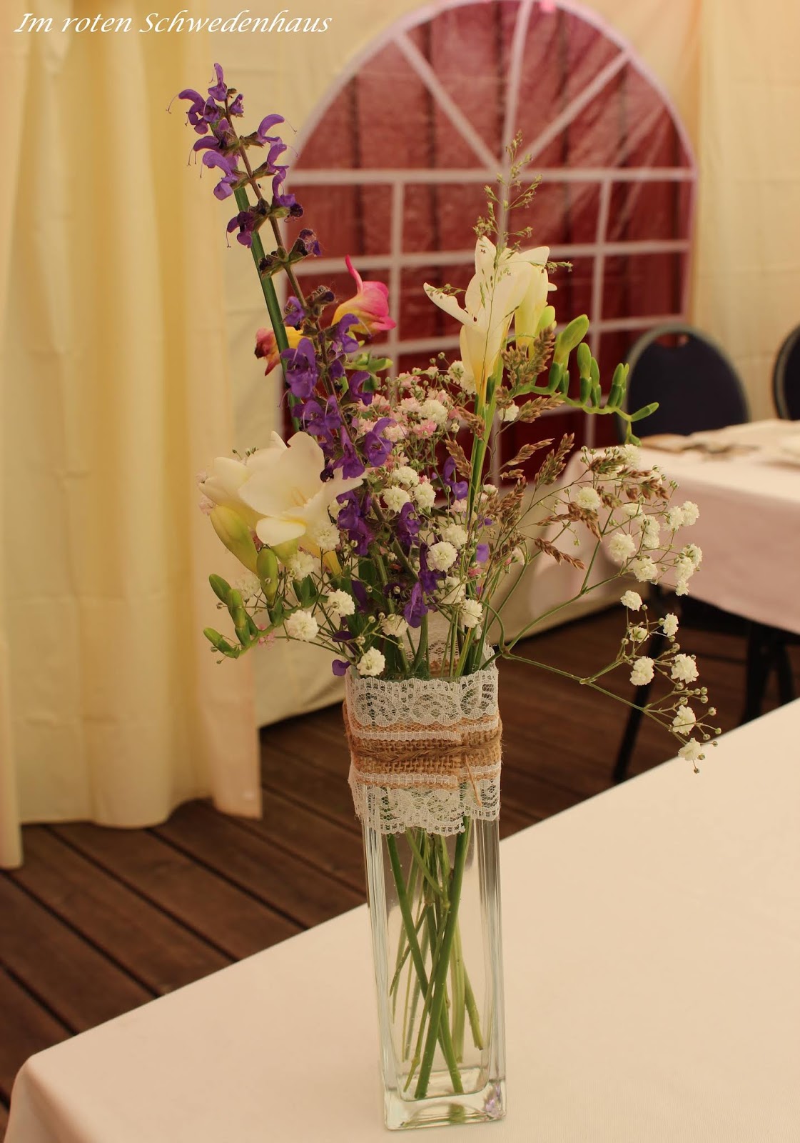 Viele unterschiedlich große mit Spitze überzogene und Paketschnur verzierte Blumenvasen, gefüllt mit Gräsern, weißen und rosafarbenen Fresien, Röschen, Nelken und Schleierkraut verliehen den Tischen einen sommerlichen und gleichzeitig nostalgischen romantisch verspielten Charakter.